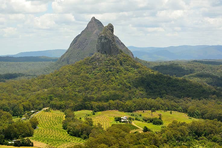 The Glass House Mountains are in the Sunshine Coast hinterlands and recognised as one of South East Queensland’s most iconic skylines. The 11 lofty peaks dominate over open forests, pine plantations, and wide grasslands.